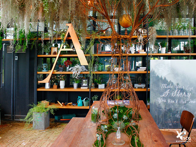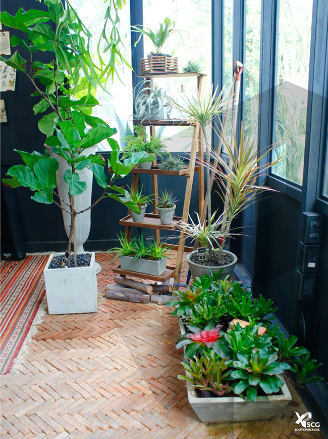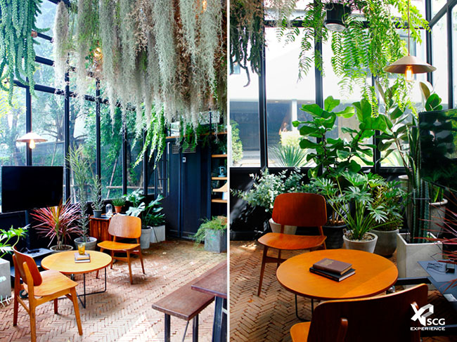 ภายในกลาสเฮ้าส์ใช้เฟอร์นิเจอร์ไม้เป็นหลักซึ่งรับมือได้ดีกับความชื้นภายในห้อง จัดวางกระถางต้นไม้ให้มีระดับทางสายตา
