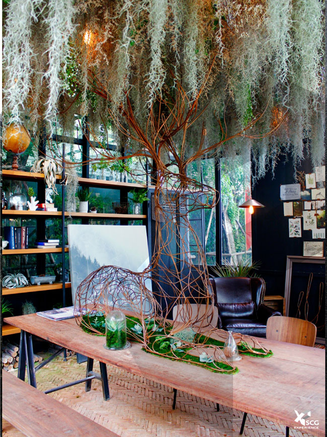 พื้นที่ตรงกลางวางเฟอร์นิเจอร์อย่างโต๊ะรับประทานอาหารใต้ซุ้มเคราฤาษีที่ห้อยจากเพดาน