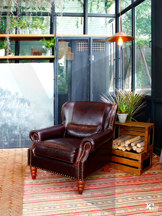 จัดเป็นมุมนั่งเล่นที่ใช้งานได้จริงภายในกลาสเฮ้าส์ มีต้นไม้ประดับอยู่รอบๆ