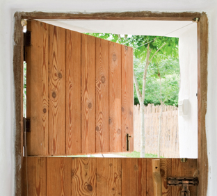 ผู้มาเยือนได้โดยแบ่งบานประตูออกเป็น 2ส่วน บานด้านบนสูง 60 เซนติเมตร ส่วนด้านล่างสูง 140 เซนติเมตร ติดบานพับแยกส่วนกัน แล้วทำกลอนล็อกระหว่างบานประตูด้านบนและด้านล่าง เพื่อให้ใช้งานได้สะดวกเมื่อต้องการเปิดใช้ประตูแบบเต็มบาน |