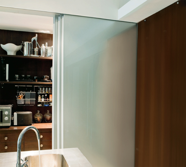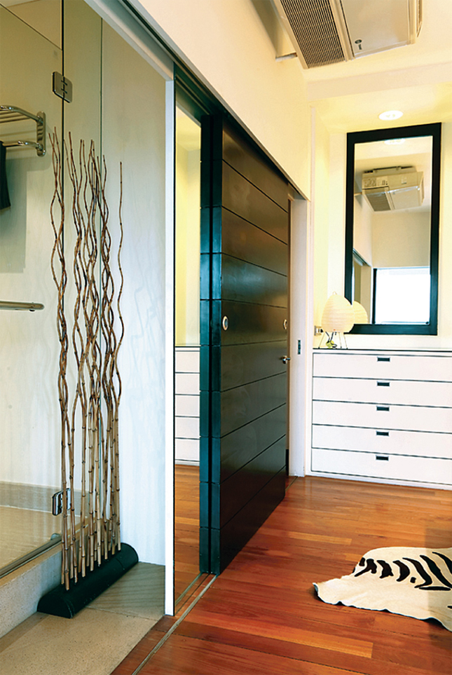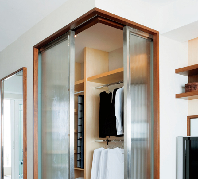 แล้วกรุกระจกฝ้าเพื่อทำเป็นหน้าบานประตู เมื่อเลื่อนมาชนกันจะเกิดพื้นที่ห้องมุมฉาก ใช้เป็นพื้นที่แต่งตัวชั่วคราว เหมาะอย่างยิ่งกับบ้านที่มีพื้นที่จำกัด