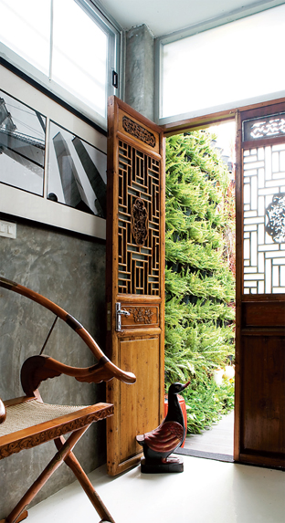 กรุแผ่นสังกะสีบนประตูบานเลื่อนให้กลืนกับผนังปูนซีเมนต์ขัดมัน เมื่อเปิดออกจะพบกับห้องด้านในที่มีลักษณะคล้ายห้องลับซ่อนอยู่หลังผนัง