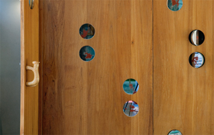 บานประตูเรียบ ๆ อาจดูน่าเบื่อ ลองสร้างลวดลายแปลกตาด้วยการเจาะช่องวงกลมหลาย ๆวงที่หน้าบาน ตกแต่งด้วยกระจกเงาตัดให้พอดีกับช่องวงกลมแต่ละวง แล้วทำแป้นหมุนให้สามารถหมุนแผ่นกระจกขึ้นลงได้
