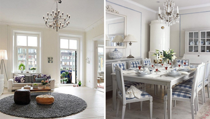 ส่วนการแต่งบ้านอีกรูปแบบ ของ Scandinavian Style ที่รับความนิยม คือ Gustavian Style ซื่งได้รับอิทธิพลจากศิลปะฝรั่งเศสและอิตาลี จะใช้ของประดับตกแต่งที่ดูหรูหรา เช่น แชนเดอเลียร์ และรูปทรงของเฟอร์นิเจอร์ที่มีความโค้ง และดีไซน์ที่ละเอียดมากขึ้น รวมถึงการนำเอาสีพาสเทลมาผสมผสานในลายผ้าบุของเฟอร์นิเจอร์ชิ้นต่างๆ