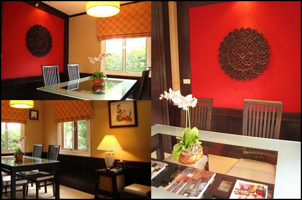 ห้องอาหารตกแต่งด้วยบรรยากาศแบบไทยโอเรียนทัล  ผนังประดับด้วยไม้สักแกะสลัก  ใช้เวอเปเปอร์สีแดงสดเป็นพื้นและเพิ่มความหรูหราด้วยการส่องไฟดาวน์ไลท์  เพื่อให้กำแพงดูโดดเด่นมากยิ่งขึ้น  แขวนโคมไฟช่วยให้ห้องอาหารดูหรูหรา  เสริมความเป็นไทยโอเรียนทัลด้วยกล้วยไม้ประดิษฐ์สีอ่อน  และช่วยเบรคความร้อนแรงของสีแดงที่กำแพงได้เป็นอย่างดีด้วย  ท็อปโต๊ะอาหารเป็นกระจกเพื่อความโปร่งแสงและทำให้แคบๆแลดูกว้างขึ้นได้  เวอเปเปอร์ของห้องเป็นสีน้ำตาลอ่อนช่วยทำให้ห้องดูอบอุ่น  เสริมบรรยกาศไทยโอเรียนทัลด้วยภาพปักครอสติสที่สะท้อนความเป็นไทยได้เป็นอย่างดี เฟอร์นิเจอร์กรุหวายพร้อมโคมไฟลายไทยก็เป็นของตกแต่งที่ช่วยเสริมบรรยากาศความเป็นไทยด้วยเช่นกัน