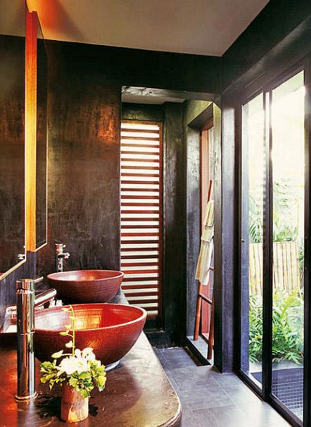 ถึงจะอยู่ในห้องน้ำก็ใกล้ชิดธรรมชาติได้ โดยติดบานเลื่อนกระจกไว้เปิดรับอากาศและแสงธรรมชาติ ทำให้อากาศถ่ายเทและยังได้แสงสว่างช่วยเวลาแต่งหน้า แล้วยังเป็นการกั้นส่วนจากพื้นที่เปียกด้านนอก ซึ่งติดตั้งส่วนอาบน้ำทั้งฝักบัวและอ่างอาบน้ำ เพิ่มสวนในร่มอีกหน่อยเพื่อเติมความรู้สึกสดชื่นชุ่มฉ่ำเหมือนกำลังอาบน้ำอยู่กลางป่า