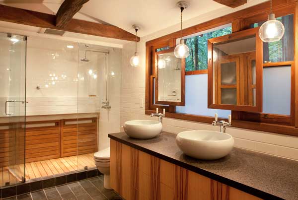 ห้องน้ำจะใช้ไม้จริงบางส่วน และจะเน้นสีผนังเป็นสีขาวเพื่อให้ดูสะอาดตา