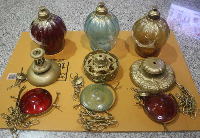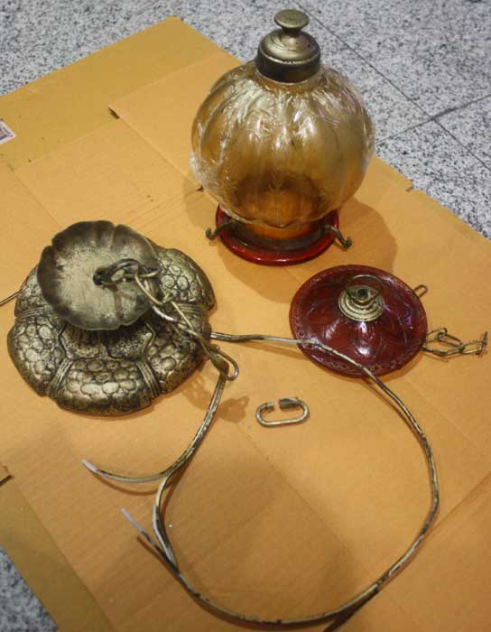 กับอีกด้านนึง เราก็เอาโคมไฟแก้วอินเดีย กับชิ้นส่วนทองเหลือง ออกมาจากห้องเก็บของ ได้มานานหลายปีมากแล้ว พร้อมกับจัดหาโซ่ห้อย ทรงแปลกตา