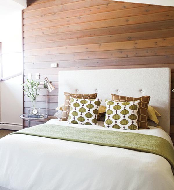 ห้องนอนห้องนี้ก็จะใช้ผนังไม้ที่เป็นแผ่นติดเรียงเป็นแนวนอนและจะใช้ที่นอนสีขาวแต่ลูกเล่นก็จะอยู่ที่หมอน