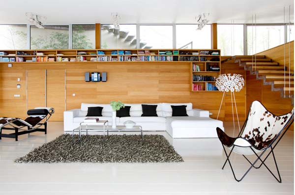 ห้องนั่งเล่นจะใช้ไม้บางส่วนจะใช้แค่กันตรงราวบันไดเพื่อให้ดูเป็นมิติ