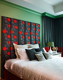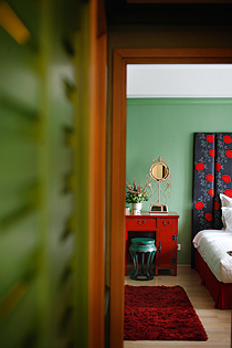 ที่สุดปลายของทางเดินมีโต๊ะสีแดงแบบเครื่องเขินจีนหยุดสายตา ก่อนจะส่งต่อให้กับพรมขนฟูและลายดอกกุหลาบที่ล่องลอยอยู่บนหัวเตียง การใช้สีคู่ตรงข้ามอาจดูต้องห้ามแต่กลับสร้างแรงดึงดูดอย่างประหลาด อย่างแดงและเขียวที่มีความสดเข้มจางที่ไม่เท่ากัน จะลดความร้อนแรงของการปะทะและช่วยสนับสนุนให้ต่างฝ่ายต่างโดดเด่นขึ้น