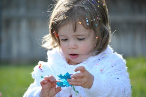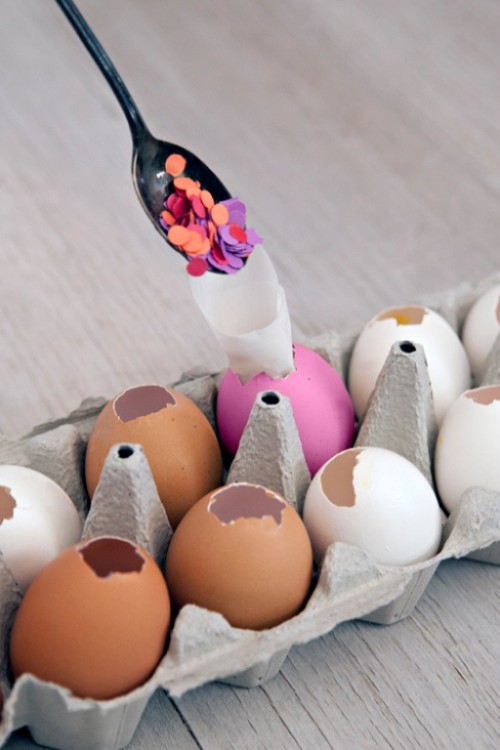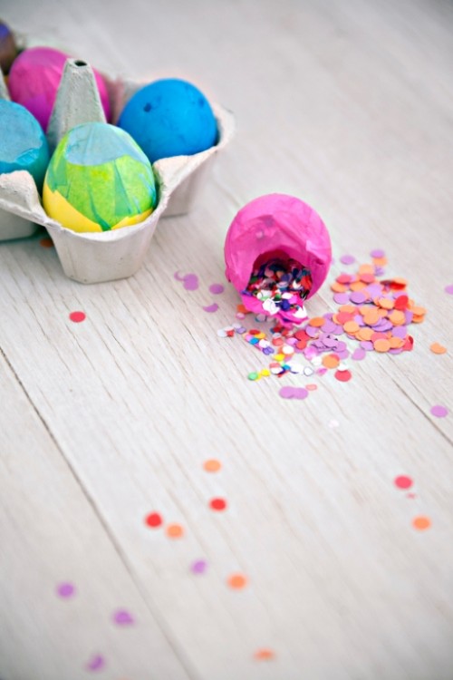 พอเปลือกไข่แห้งแล้วเพื่อนๆ ก็นำมาประยุกค์ใช้ได้เลยค่ะ ด้วยการนำกระดาษสี่ที่เราเจาะไว้หลายๆ สีมาใส่ลงไปในเปลือกไข่ค่ะ