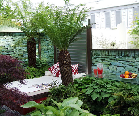 เป็นไอเดียสำหรับพื้นที่ร่ม และไม่ต้องดูแลมากจนเกินไป ฉากเพ้นต์ภาพแอบสแตร็กต์ทำให้สวนดูน่าสนใจมากขึ้นเมื่อมองมาจากมุมห้องรับประทานอาหารด้านในบ้าน