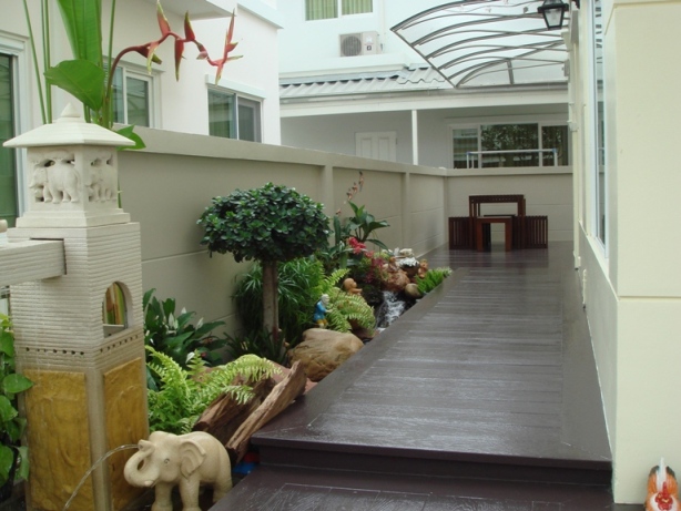 พื้นที่สวนด้านข้างบ้าน แม้กว้างไม่มากนัก แต่สามารถจัดเป็นมุมน้ำตก ที่มองได้จากห้องนั่งเล่น เป็นมุมเล็กๆ ที่สร้างความชุ่มชื่นทุกครั้งที่มองสวนหินด้านหลังบ้าน