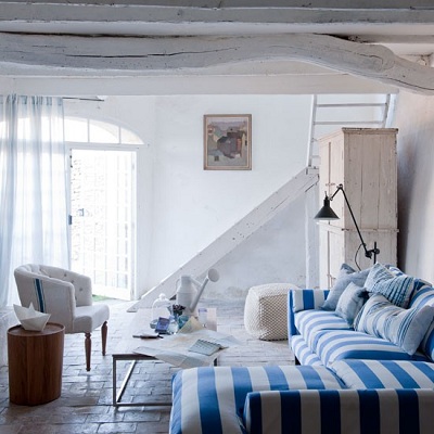ลองสร้างอารมณ์แบบ Beach House ด้วยการใช้สีฟ้า-ขาว ในลักษณะเป็นลายทางลงบนพื้นไม้ หรือ เลือกใช้สิ่งทออย่าง พรม ปลอกหมอน หรือ ผ้าคลุมเตียง ที่มีลวดลายในลักษณะเดียวกันมาทดแทนการทาสีก็ได้ค่ะ