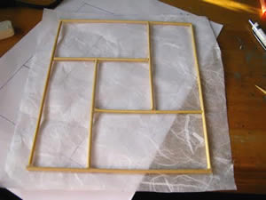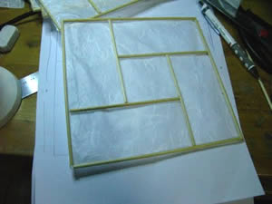 4. ตัดกระดาษสาให้ใหญ่กว่าขนาดจริงเล็กน้อยทำการติดกาวระหว่างกระดาษสากับกรอบไม้ไม่จะเป็นต้องใช้กาวเยอะมากให้ฉีดกาวตามบริเวณรอยต่อก็เพียงพอเราไม่จำเป็นต้องให้กระดาษสาติดแน่นหนามากนัก
