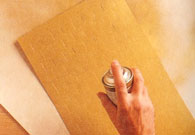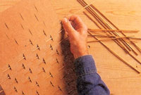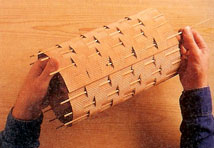 คราวนี้คว่ำกระดาษให้ด้านลูกฟูกอยู่บน นำไม้เสียบมาเสียบตามรูที่กรีดช่องไว้ ที่ขอบกระดาษให้ไม้ยื่น