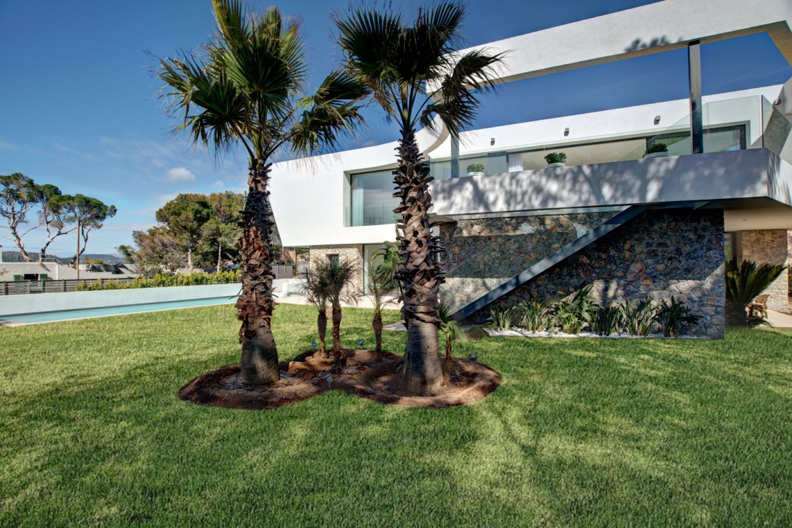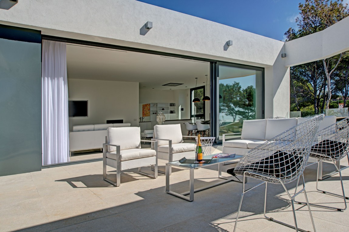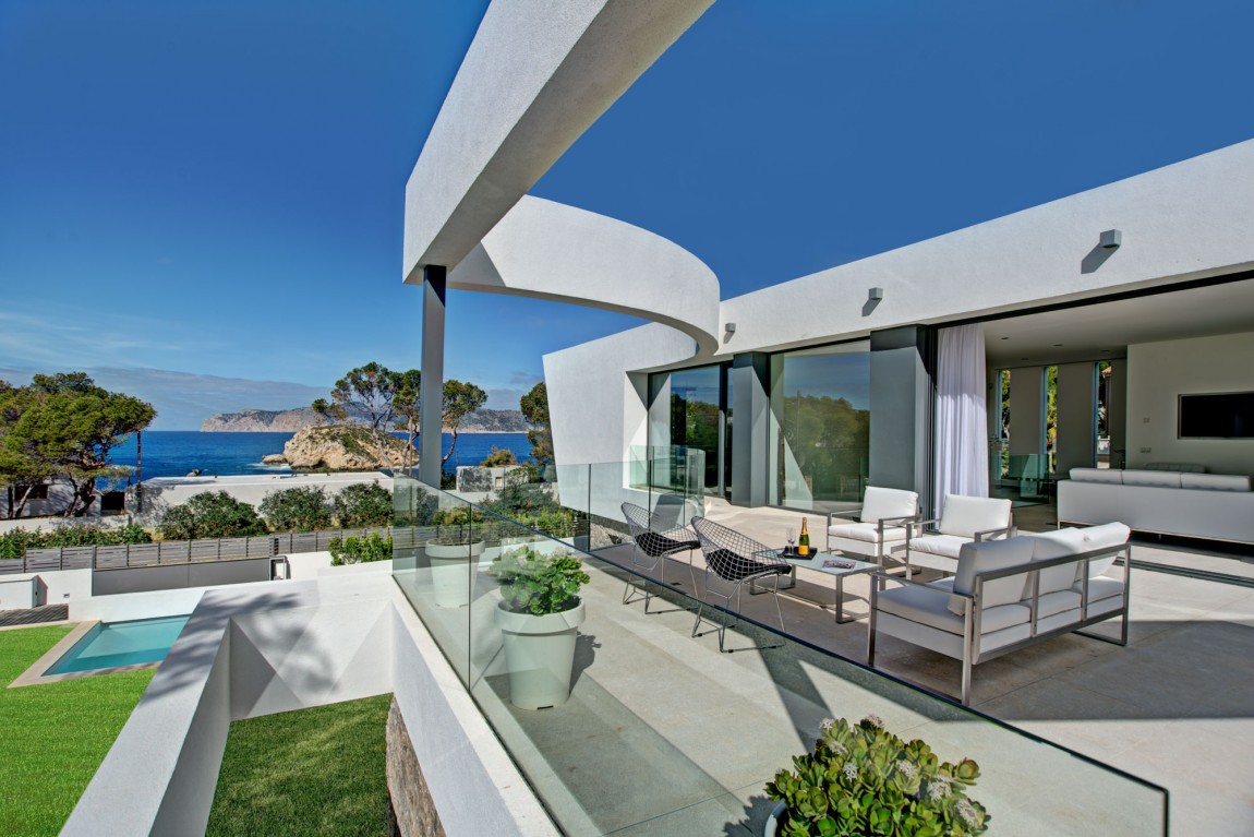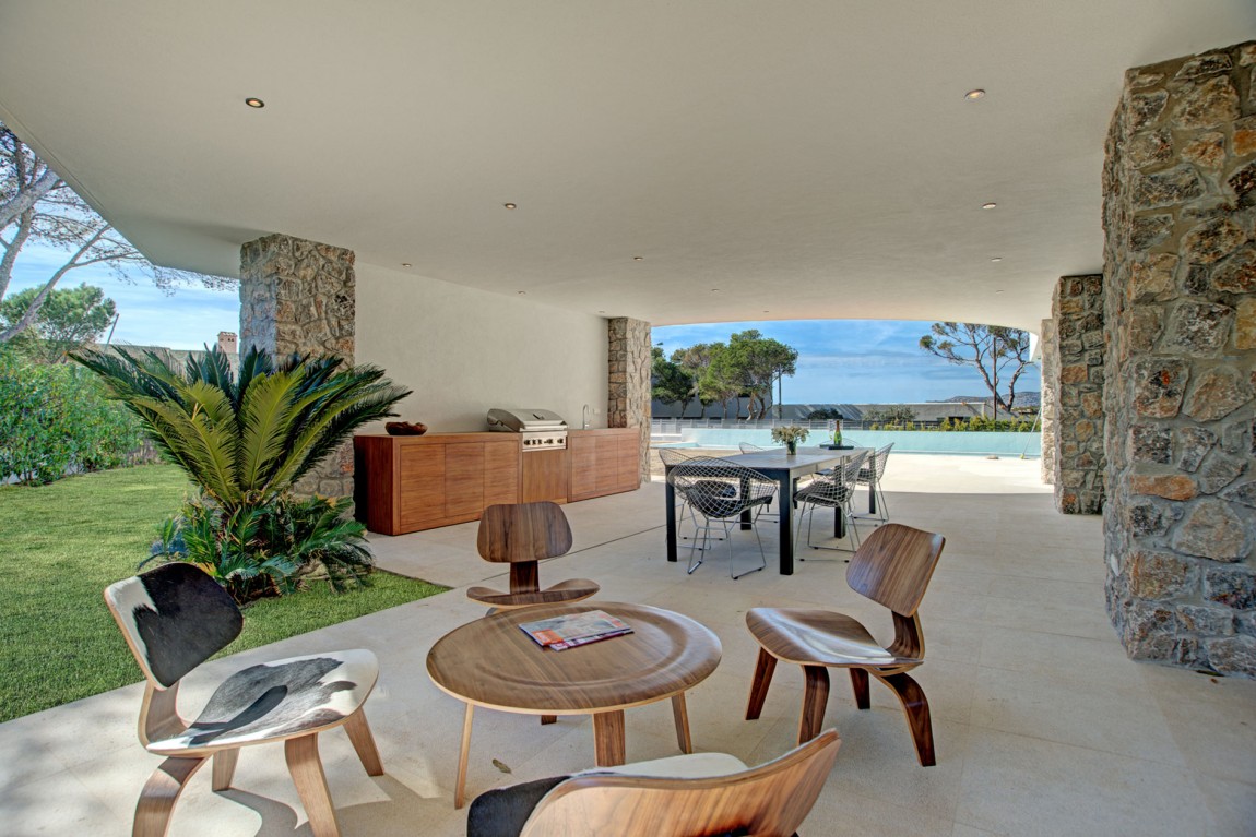 สถาปัตยกรรมโดยรวมของบ้านก็คือการผสมผสานที่ดีของความร่วมสมัยที่มีความหมาย Midcentury (ไม้และโลหะมีบทบาทสำคัญในการตกแต่งภายใน) ทั้งนี้ส่วนที่ดีที่สุดของบ้านคือการเปิดมุมมองที่สวยงามของชายฝั่งทะเลเมดิเตอร์เรเนียนที่มีหาดทรายและน้ำทะเลสีฟ้าคราม