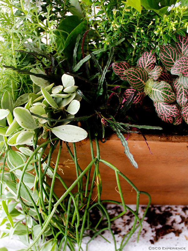 2.ปลูกต้นมะลิซึ่งสูงที่สุดเป็นอันดับแรก จัดวางให้ได้จังหวะที่พอดี  ต่อด้วยไม้ระดับกลางคือเวอร์บีน่า หลิวดอกขาว ผักชีฝรั่ง ไผ่เงิน ปิดท้ายด้วยเดป เดปสายฝน เฟิร์น และสับปะรดสี ซึ่งเป็นไม้ทรงเตี้ย ให้เกิดระดับสูงกลางต่ำ