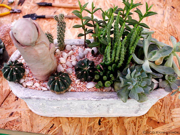 สวนถาดแบบแห้ง ใช้แคคตัสและไม้อวบน้ำจัดตกแต่งในกระถางซีเมนต์