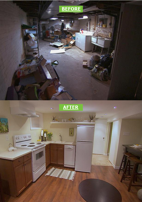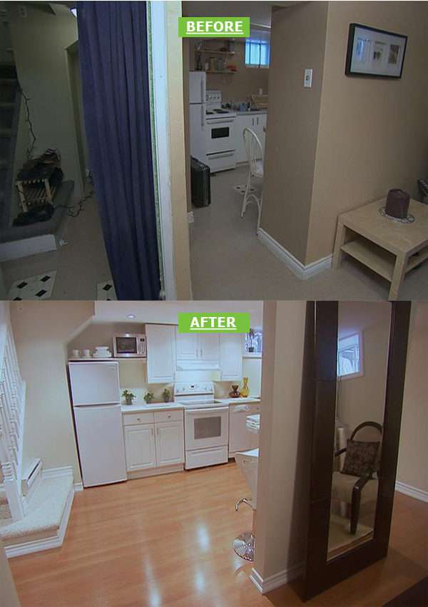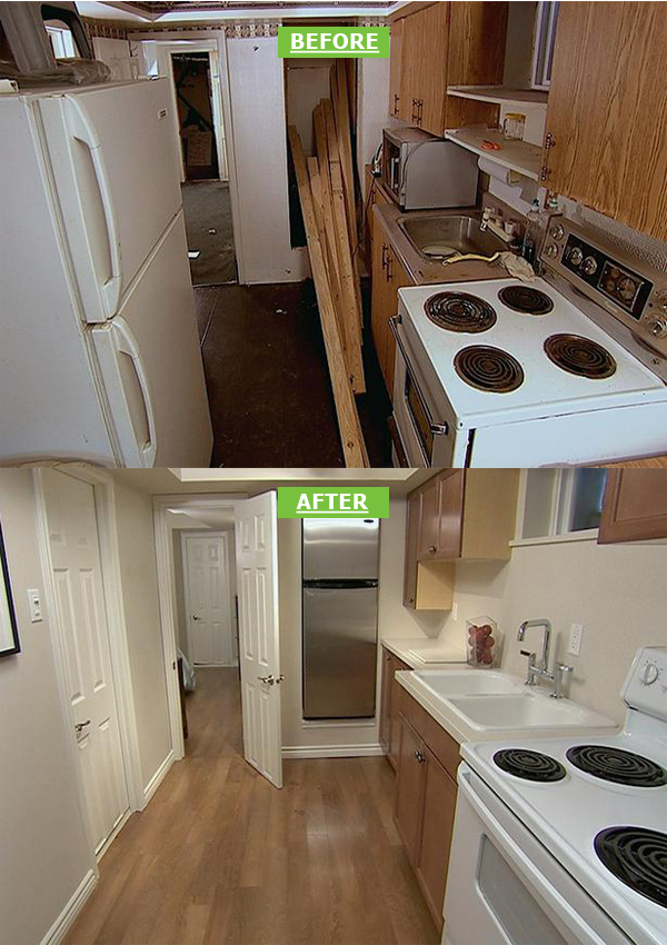 ห้องครัว จากที่ดูแคบ ทำให้ดูโล่งขึ้น โดยการเคลียร์เฟอร์นิเจอร์ที่ไม่จำเป็นและและทำพื้นห้องใหม่ ดูโล่งเหมาะแก่การเตรียมอาหารดีทีเดียว