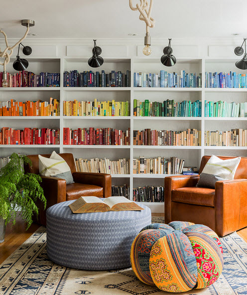 เริ่มจากห้องนั่งเล่น ถ้าคุณมีชั้นหนังสือ การจัดเรียงโดยแยกออกตากสีสันของปกหนังสือก็เป็นอีกไอเดียนึงในการไล่สีให้ดูสวยงาน ถือว่าเป็นศิลปะอย่างนึง แต่นักอ่านคงต้องมีความจดจำและหาหนังสือยากซักหน่อย แต่มันก็คืองานศิลป์ที่น่าลองนะ