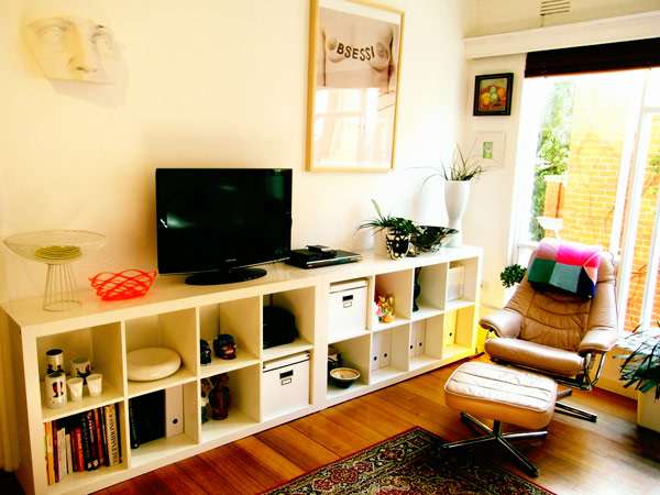 จัดมุมๆหนึ่งเป็น ห้องนั่งเล่นที่แสนจะลงตัวด้วยการใช้ที่เก็บของตัวยาวๆ มาชิดมุมและเป็นที่วางทีวี เป็นมุมที่ลงตัวมาก