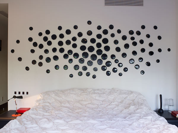 ส่วนห้องนอนห้องนี้จะออกแบบด้วยผ้าปูที่มีลวดลายที่ยับยู่ยี่ และพนังหัวเตียงก็จะตกแต่งให้ดูเป็นจุด