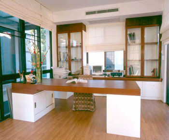 เป็นมุมทำงานในคอนโดริมแม่น้ำเจ้าพระยา ป็นแบบห้องสตูดิโอ ที่ต้องการพื้นที่ทำงานค่อนข้างมาก ดังนั้นจึงออกแบบให้เป็น เคาน์เตอร์ยาวขนานไปกับผนังด้านหนึ่งของห้อง เน้นการใช้สีขาว และไม้สีโอ๊คแบ่งออกเป็นโต๊ะทำงาน 2 ที่ขนาบข้างด้วยตู้เสื้อผ้าหน้าบานกระจกเงาเพื่อเพื่มมิติให้กับห้องให้ห้องดูกว้างขึ้น เน้นความเป็น Modern