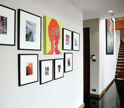 สิ่งหนึ่งที่ช่วยสร้างความน่าสนใจให้ผนังเรียบเกลี้ยงได้ดีก็คือ การประดับงานศิลปะ ไม่ว่าจะเป็นภาพวาดหรือภาพถ่าย ซึ่งมักอยู่ในกรอบรูปหรือไม่ก็เฟรมผ้าใบ การจัดวางให้ดูสวยงามและเป็นจุดเด่นต้องคำนึงถึงขนาด สีสัน แสงสว่าง และระดับในการมอง ตัวอย่างเหล่านี้จะเป็นไอเดียให้คุณนำงานศิลปะมาตกแต่งผนังบ้านได้อย่างน่ามองมากขึ้น ลองดูกันค่ะ
