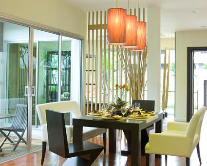 ห้องอาหารนี้ยังคงความเป็นแนวร่วมสมัยอย่างชัดเจน ดีไซด์ของโต๊ะอาหารที่เรียบง่าย เน้นการตกแต่งด้วยของน้อยชิ้น โคมไฟเพดานดูออกแนวโอเรียนทัลเล็กน้อย แต่ก็เป็นการ Mix & Match ได้อย่างกลมกลืน