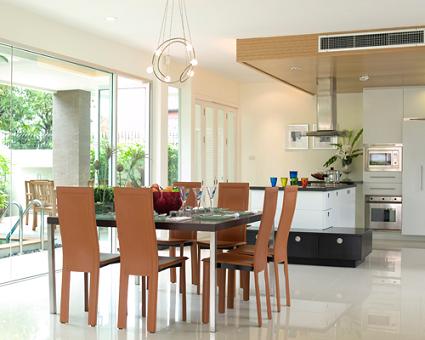ความเป็น Contemporary นั้นแสดงออกโดยการใช้โต๊ะอาหาร และเก้าอี้ที่มีดีไซด์สวยงาม ทันสมัย กอปรกับการตกแต่งให้ดูบ้านกว้างขวาง การนำกระจกเข้ามาช่วยทำให้บ้านดูโปร่งขึ้นเป็นอย่างมาก