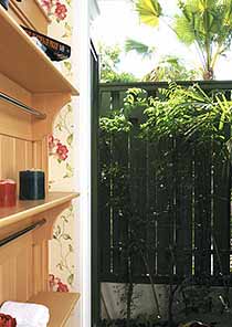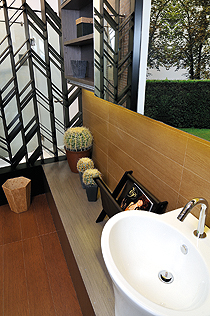 ส่วนห้องน้ำที่มีพื้นที่มากหน่อย อาจออกแบบผนังด้านหนึ่งเป็นประตูบาน เลื่อนกระจกใส แล้วจัดพื้นที่สีเขียวไว้ด้าน นอก เพื่อให้สามารถรับแสงแดดและฝนได้้โดยตรง โดยที่คุณยังสามารถเพลิดเพลินไปกับความผ่อนคลายของธรรมชาติผ่านผนังกระจกใสได้