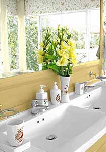สำหรับท่านที่อยากจะมีมุมธรรมชาติผ่อนคลายไว้ในห้องน้ำบ้าง แต่อาจไม่สะดวกที่จะเลือกหาหรือดูแลพันธุ์ไม้ต่าง ๆ ก็อาจใช้วิธีเติมธรรมชาติผ่านลวดลายดอกไม้หรือต้นไม้บนกระเบื้องกรุผนังหรือกระเบื้องปูพื้นแทน หรือจะเลือกใช้โทนสีเด่นของห้องน้ำเป็นสีวรรณะเย็นอย่างเช่น สีเขียวหลากเฉด มาตกแต่งแทน ซึ่งแม้ว่าจะมีชีวิตชีวาเทียบไม่ได้