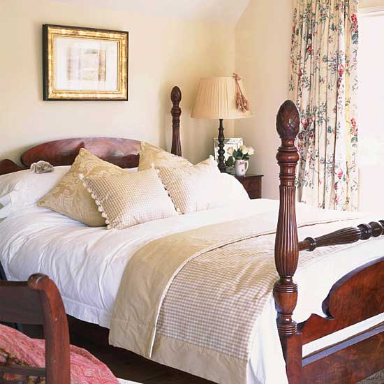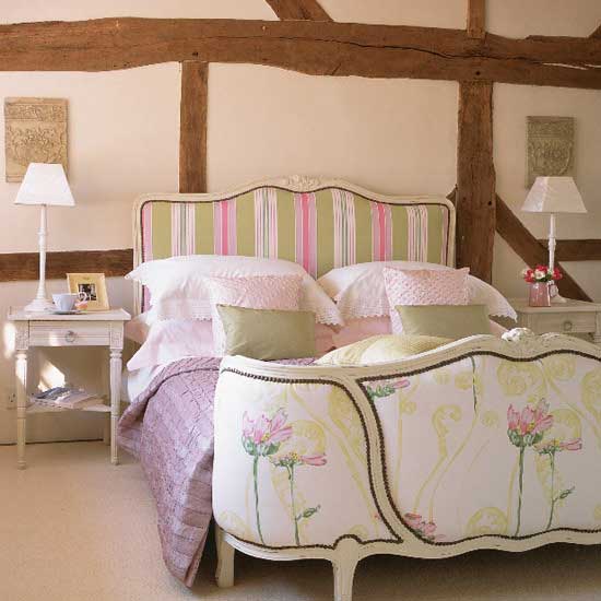 ห้องนอนสไตล์คันทรี่กับเตียงสไตล์ฝรั่งเศสสุดคลาสสิค  ลวดลายสีเขียว และสีชมพูตัดกับสีครีมได้อย่างสวยงาม  แม้แต่หมอนก็ใช้สีโทนเดียวกันหมด