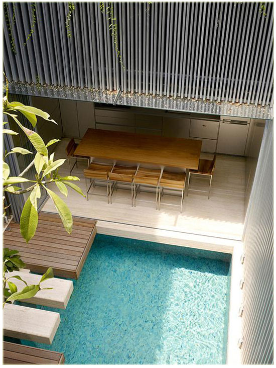 บ้านโมเดิร์นดีไซน์สวยๆในสิงคโปร์กับเทรนด์สระว่ายน้ำภายในบ้าน อีกด้านของตัวบ้านสร้างเป็นไม้ยื่นออกมาสลับกันห่างมีช่องว่างเพื่อมองเห็นสระว่ายน้ำด้านล่างจากตัวอาคารและเชื่อมต่อกับห้องรับประทานอาหารซึ่งสามารถเดินชมทั่วสระว่ายน้ำ
