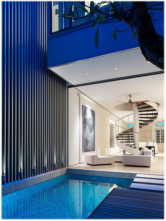 บ้านโมเดิร์นดีไซน์เก๋ไก๋โดดเด่นที่การวางราวบันได เป็นวงก้นหอยไม่เปลืองพื้นที่และยังดูหรูมีสไตล์ พื้นที่ว่างด้านล่างจัดทำเป็นห้องนั่งเล่นเล็กๆ สำหรับพักผ่อนใกล้ๆกับสระว่ายน้ำที่สวยโดดในยามค่ำคืนด้วยแสงไฟสีน้ำเงินที่ส่องจากด้านล่างให้ดูเป็นเหลี่ยมมุมของผนัง เพิ่มบรรยากาศเย็นสบายๆในตอนกลางคืน