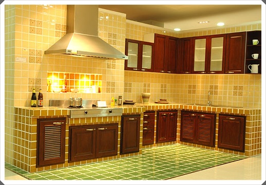 ห้องที่รับบทหนักทั้งควันไฟ คราบน้ำมัน คราบเขม่า กระเบื้องที่เหมาะสมต้องคงทน ทำความสะอาดง่าย ส่วนสีนั้นเลือกสีที่ช่วยสร้างบรรยากาศดี ๆ ให้เจริญอาหารแบบสีอ่อนหรือสีที่สดใส เช่น สีครีม สีเหลือง สีฟ้า นอกจากนี้ถ้าเติม