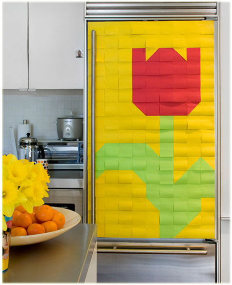 ไอเดีย DIY แต่งบ้านในครั้งนี้จะนำเสนอการตกแต่งบ้านด้วยกระดาษโน๊ต หรือ ที่เรียกว่า Post it นั้นเอง เราไปดูวิธีการและตัวอย่างกันดีกว่าคะ ลวดลายตู้เย็นที่เห็นอยู่นี้มาจากไอเดียในหนังสือ DAVID STARK DESIGN ของ David Stark ซึ่งเขาใช้วัสดุที่เราหาได้ง่ายๆ อย่าง กระดาษโน้ต Post it มาแปะที่ตู้เย็นหรือผนังจนเป็นลวดลายสวยงามขึ้น ซึ่งวิธีการที่เขาใช้ก็ไม่ยากเลย เราก็สามารถนำมาทำกันได้