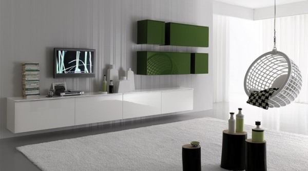 2. หากใครชอบงานสไตล์ Modern ต้องกรี๊ดกับห้องรับแขกนี้แน่ๆ ค่ะ ที่จัดมุมหนึ่งของชั้นล่างให้เป็นเพื้นที่ของห้องรับแขก ห้องนี้ตรงกับประตูใหญ่ของบ้าน และยังเป็นห้องที่ได้มุมติดกับสวนและบ่อเลี้ยงปลาทำให้รู้สึกผ่อนคลาย ที่ปลื้มที่สุดของห้องนี้เห็นจะเป็น โซฟารูปถั่วที่สามารถนั่งได้ 2 ด้าน ทำให้เราสามารถเลือกได้ว่าจะหันหน้าออกสู่สระน้ำ และประตูใหญ่ หรือ จะหันหน้าเข้าเพื่อดูทีวีก็ได้ค่ะ รับกับการเล่นระดับฝ้าที่เลือกโคมขนาดใหญ่แขวนตกแต่งกลางฝ้าหลุม ห้องรับแขกสีขาวทั้ง ส่วนผนังทั่วไป และเน้นแผงแขวนทีวีด้วยผนังกรุเซาะร่องสีขาวลายเส้น เพิ่มความโดดเด่นของแผงนี้ด้วยผนังด้านข้างทาสีเขียวตองสด เป็นจุดดึงสายตาได้เป็นอย่างดีค่ะ เป็นห้องรับแขกสไตล์โมเดิร์นที่ใครเห็นก็กรี๊ดค้า