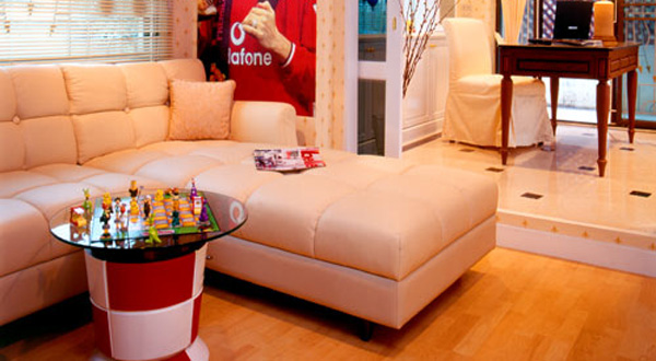 4. ห้องนี้เป็นอีกห้องหนึ่งที่เป้นงานสไตล์ Modern เน้นสีสรรสดใส และที่แปลก คือ ห้องรับแขกห้องนี้อยู่ชั้น 2 ของบ้านค่ะ เป็นห้องรับแขกที่สวยมากมากห้องหนึ่งค่ะ แต่อาจจะเป็นเพราะต้องการความเป็นส่วนตัวห้องรับแขกจึงยกมาอยู่ชั้น 2 ของบ้านค่ะ เป็นห้องรับแขกที่ทีมโครงการกรี๊ดค่ะ เพราะด้วยความที่ห้องรับแขกนี้มี mini bar สีแดงสด เป็นตู้ซ่อนไว้ หรือที่เราเรียกกันว่า ชุดครัวเอกะ นำมาพัฒนาต่อเป็น mini pantry ด้านหลังโซฟาค่ะ  โดยคอนเซ็ปหลักคือ ต้องการชุดครัวเล็กๆ เพื่อเตรียมอาหารง่ายๆ และอยากให้ซ่อนไว้ในผนังหากเวลามีแขก หรือไม่ต้องหารให้ทราบว่าตรงนี้มีครัวตั้งอยู่ ภายในตู้จะมีตั้งแต่เตาไมโครเวฟ ซิงค์สำหรับล้างแก้ว จาน ที่คว่ำจาน ที่เก็บเครื่องปรุง อาหารแห้ง