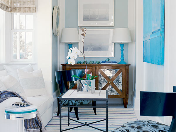 6. ห้องรับแขกสไตล์ Neo Classic แบบตะวันตก ผสมผสานกับเฟอร์นิเจอร์ลอยตัวที่เป็นของเก่าของตะวันออก เป็นห้องรับแขกที่เป็นส่วนผสมของวัฒนธรรมตะวันออกและตะวันตกได้อย่างลงตัว ค่ะ เป็นห้องรับแขกของ Home Office แห่งหนึ่งบนถนนพระราม 3 พรมสีแดงเลือดหมูรองรับเฟอร์ทั้งหมดกลาง ห้องทำให้ห้องดูซอล์ฟลง มีการจัดวางตั้ง 2 ตั้งใช้เบาะบุผ้าบุสีขาวเพื่อช่วยลดทอนสีเข้มของเฟอร์นิเจอร์อื่นๆ ที่เป็นสีเข้ม ทำให้ห้องดูสว่างไม่ทะมึนเกินไป วางไว้ทั้ง 2 ด้านของห้องใช้แทน Day beds ได้เป็นอย่างดี นอกจากนี้ เฟอร์นิเจอร์ ประติมากรรม และของตกแต่งที่เป็นของเก่า ถูกจัดวางได้อย่างลงตัว เป็นการจัดวางที่แสดงให้เห็นถึงความเชื่อและความคิดระหว่างผู้คนที่ต่างยุค ต่างสมัย แต่สามารถนำมาประยุกต์และปรับใช้ร่วมกันได้อย่างมีศิลปะทีเดียวค่ะ