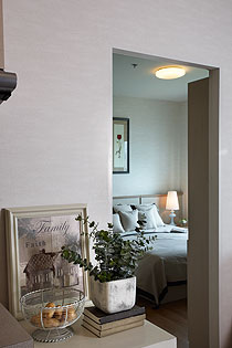 ในพื้นที่ขนาดไม่ใหญ่การใช้สีขาวหมดในแต่ละระนาบ พื้นผิวและวัสดุ ทั้งผนัง เพดานหรือแม้แต่โซฟา เก้าอี้ โต๊ะ จะทำให้ห้องดูโล่ง โปร่ง กว้าง เลือกใช้บัวผนังสีเดียวกับไม้พื้นสีอ่อนจะลวงตาให้ดูหมือนพื้นห้องนั้นกว้างขึ้นอีกนิด รวมๆ เข้าด้วยกันทั้งหมดก็ทำให้ห้องเล็กดูใหญ่ขึ้นได้ไม่ยาก