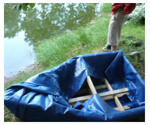 นำ ผ้าใบมาพันให้รอบและคลุมลงไปที่โครงไม้ที่เราทำขึ้น ดึงให้ตึง จากนั้นปักหมุดให้ทั่ว เพื่อกันการเลื่อนหลุด ก็จะได้เรือหนีน้ำท่วมที่สามารถทำได้ด้วยตนเอง