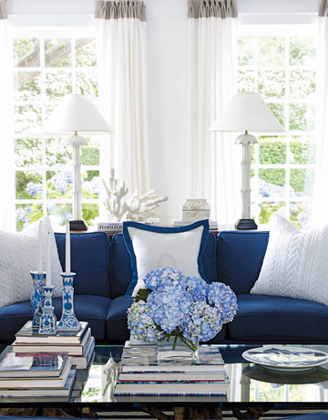 David Lawrence ใช้สีฟ้าและขาวเพื่อทำให้ห้องนั่งเล่นนี้อบอุ่นสง่างามมากขึ้น ผ้าที่คลุมโซฟาคือผ้าใหม  Vizir สีน้ำเงินเข้ม