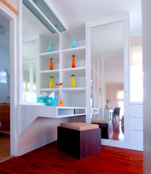 จากห้องนอนใหญ่มีประตูสำหรับเข้าห้องน้ำได้อีกทางหนึ่ง จึงมีการใช้ไม้ระแนงสีขาวเพื่อบังตา และเพื่อเป็นการแบ่งโซนพื้นที่ห้องอีกด้วย ฝั่งตรงข้ามกับทางเข้าห้องน้ำเป็น walk in closet สุดหรูสีขาวทั้ง set เลือกใช้กระจกเงาบานใหญ่เพื่อเพิ่มมิติให้กับห้อง รวมทั้งยังช่วยสร้างความสว่างให้กับส่วนแต่งตัวนี้อีกด้วย