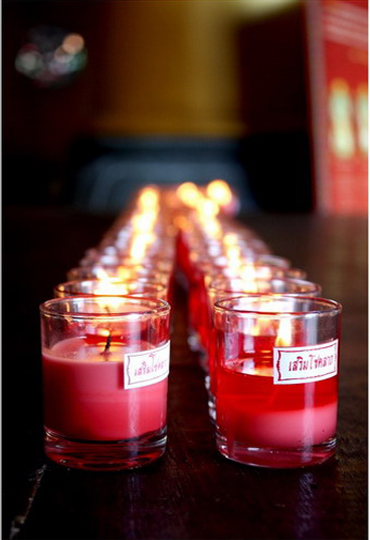 เทียนสีแดง : เทียนสีแดงเป็นสัญลักษณ์ของความเร่าร้อน ทางเพศ ความรัก การตื่นตัว และมันยังถือ ว่าเป็นสุดยอดแห่งสีสันของชีวิตอีกด้วย เหมาะอย่างมากหากคุณต้องการกระตุ้นความปรารถนาทางเพศ ของอีกฝ่ายหนึ่ง เป็นที่น่าแปลกเหมือนกันที่ว่า จากการทดสอบกับผู้ชายอเมริกันจำนวนสามสิบคนพบว่า มากกว่ายี่สิบห้าคน มีความหึกเหิมทางเพศมากขึ้นกว่าเดิม เมื่อเห็นเทียนสีแดงพร้อมกับแสงไฟที่ลุกโชน