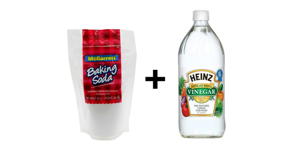 -ใช้ baking soda กับน้ำส้มสายชู โดย ผสม baking soda 1/3 ถ้วยในน้ำส้มสายชู 1 ถ้วย (ไม่ควรเทในครั้งเดียว ควรค่อยๆผสมเพราะเมื่อผสมกันจะมีฟองขึ้นพอสมควร)