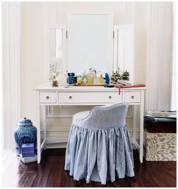 โต๊ะเครื่องแป้งสีขาวตัดกับพื้นไม้สีเข้มและเก้าอี้ทรงแปลกที่บุผ้าเป็นจีบกระโปรงสีฟ้า  ดูเรียบง่ายแต่แฝงไว้ด้วยสไตล์และกลิ่นอายของผู้หญิงอย่างเต็มเปี่ยม