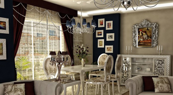 ห้องนี้มีลักษณะคลาสสิกที่ทันสมัยประดับด้วยโคมระย้า โคมไฟสีฟ้าและสีดำ ออกแบบโดย HePe Design